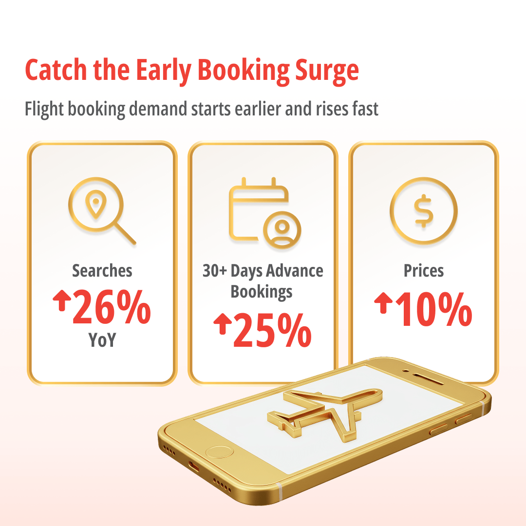 Despite concerns around flight cancellations and rising fuel surcharges, outbound travel demand remains resilient. Travelers are locking in plans earlier to hedge against uncertainty, reinforcing the importance of early-funnel engagement. Tongcheng data indicates1,