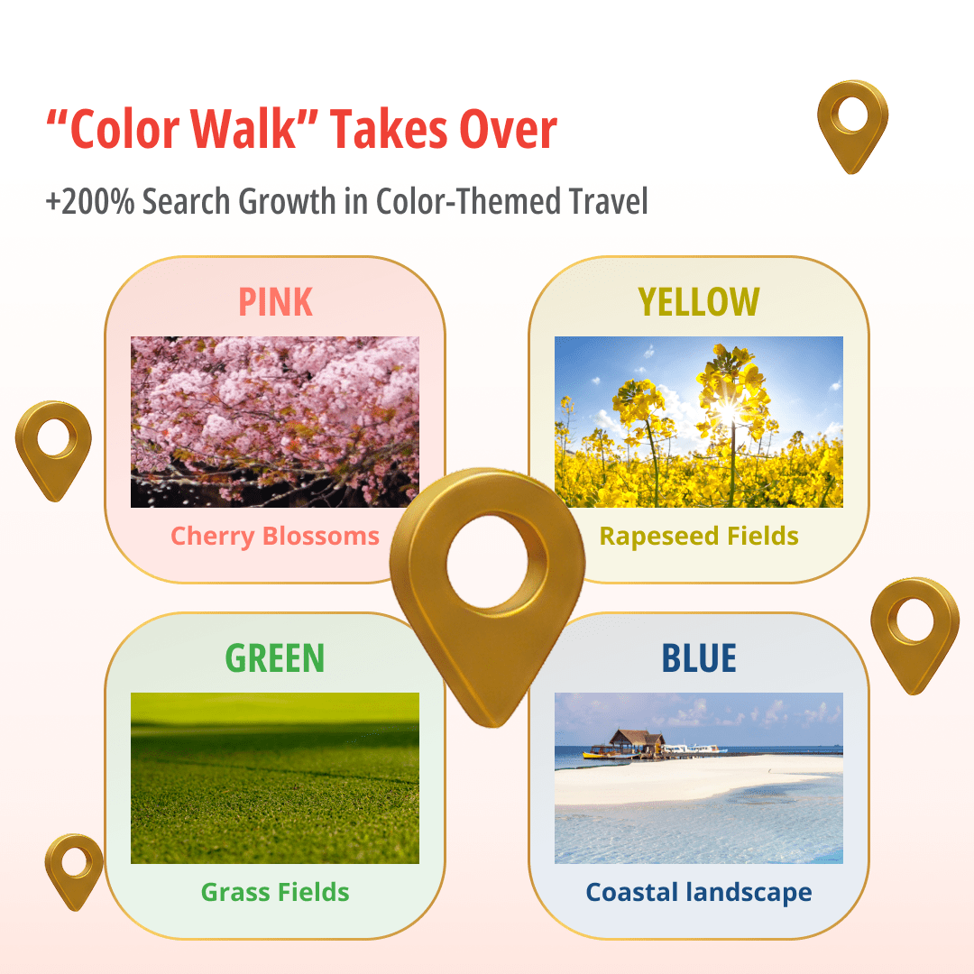 - “Color Walk” trend (+200% search growth on Tongcheng1) emphasizes visual and emotional experiences